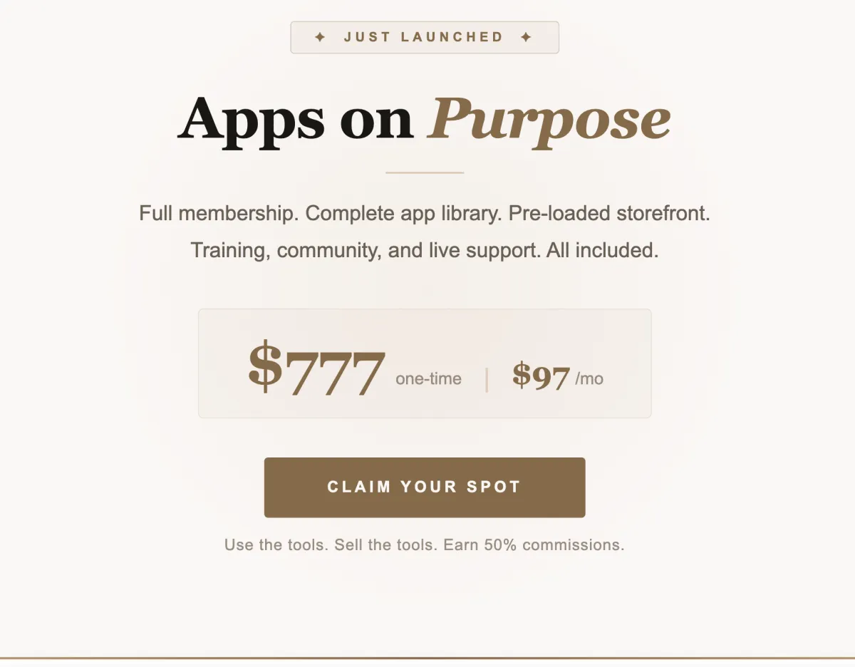 Most affiliate programs give you a link and wish you luck. Apps on Purpose gives you a preloaded storefront, the actual products, training on how to sell, and a community that supports you through every step.